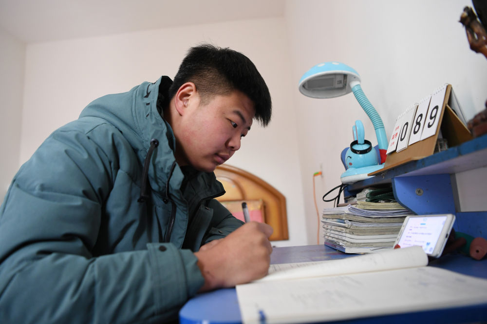3月10日,徽县一中高三年级学生唐浩在家中通过网络课堂学习。新华社记者陈斌摄