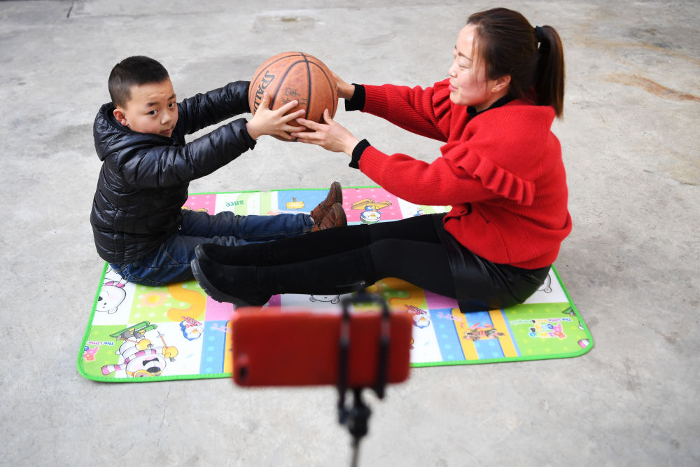 3月9日,徽县实验小学二年级学生杨金城(左)和母亲在家中按照“微课堂”视频锻炼身体。新华社记者陈斌摄