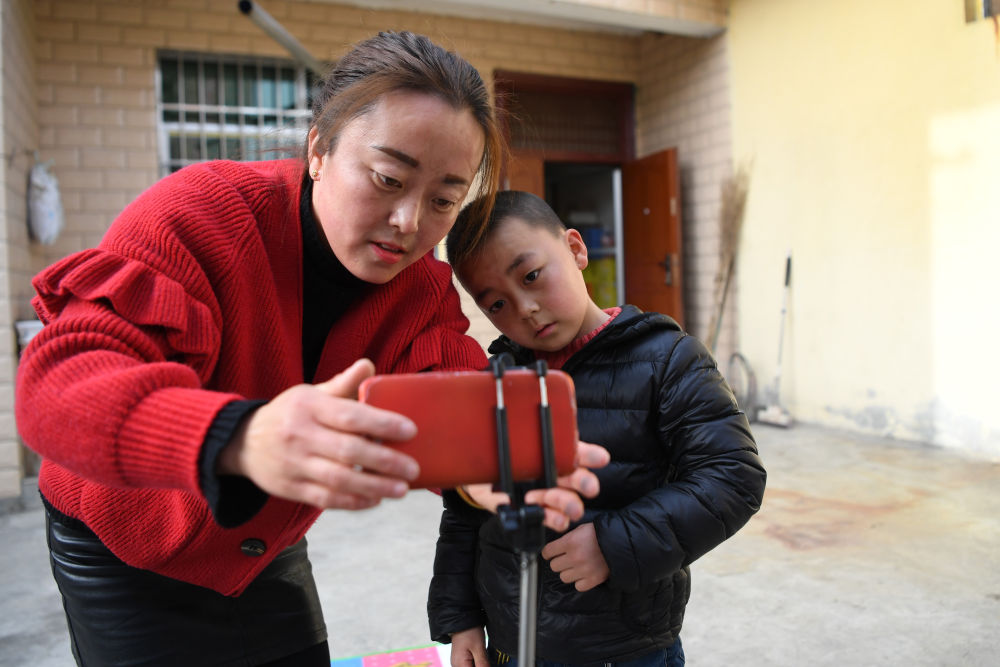 3月9日,徽县实验小学二年级学生杨金城(右)和母亲上课前调整手机。