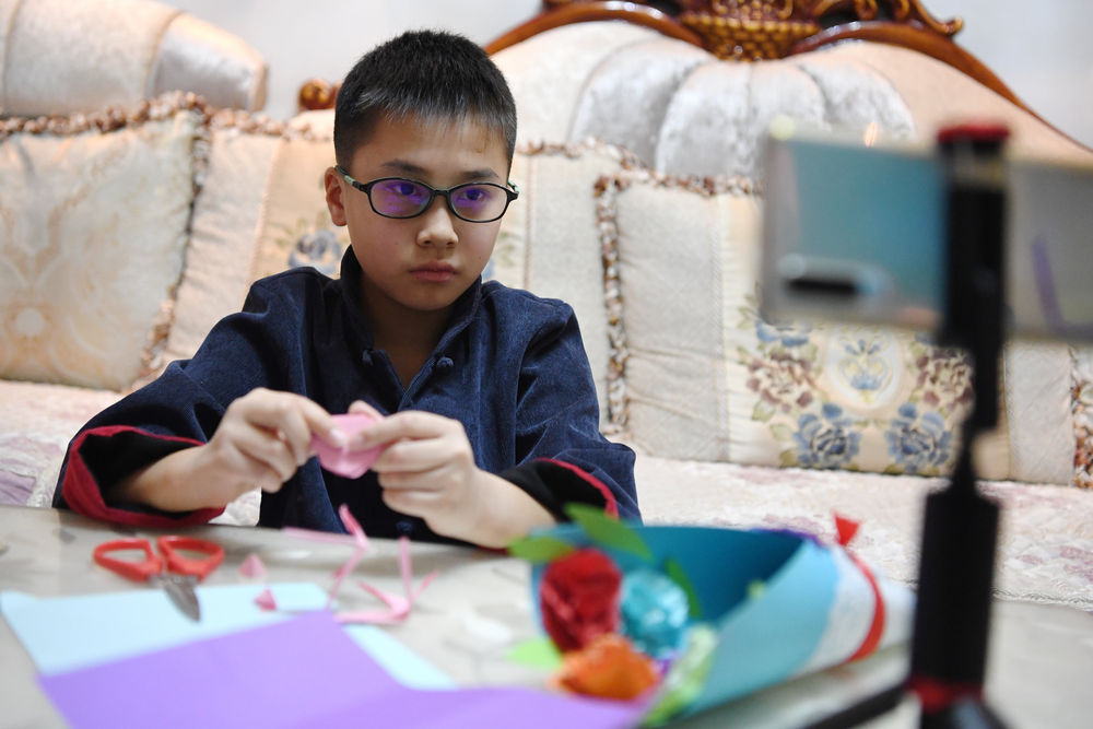 3月9日,徽县实验小学五年级学生马子涵在家中按照“微课堂”视频练习做手工。新华社记者陈斌摄