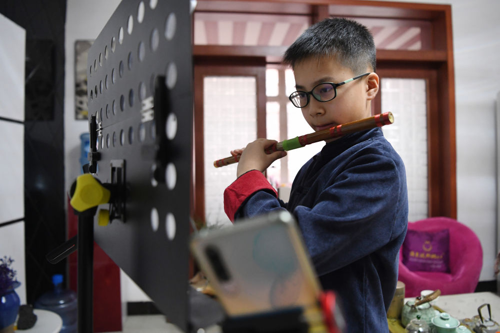 3月9日,徽县实验小学五年级学生马子涵在家中按照“微课堂”视频练习吹笛子。新华社记者陈斌摄