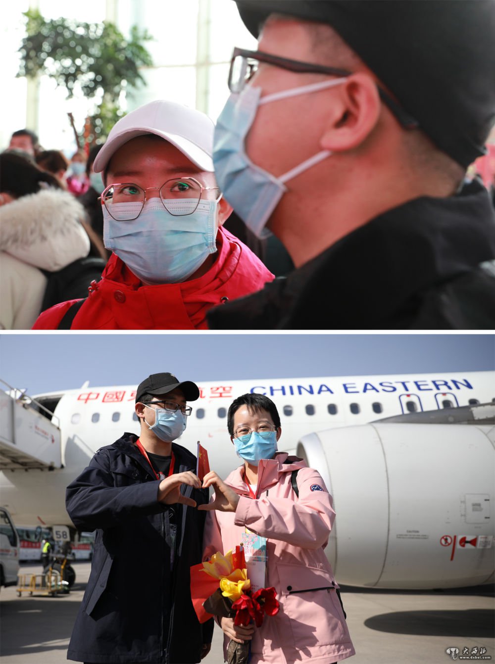 拼版照片上图是2月19日,甘肃省第三人民医院护士王潇玉(左)与丈夫刘世杰一起办理值机。夫妻二人都是甘肃省第五批援助湖北医疗队队员。下图是3月22日,王潇玉与刘世杰一起抵达兰州中川国际机场。新华社发(杜哲宇摄)