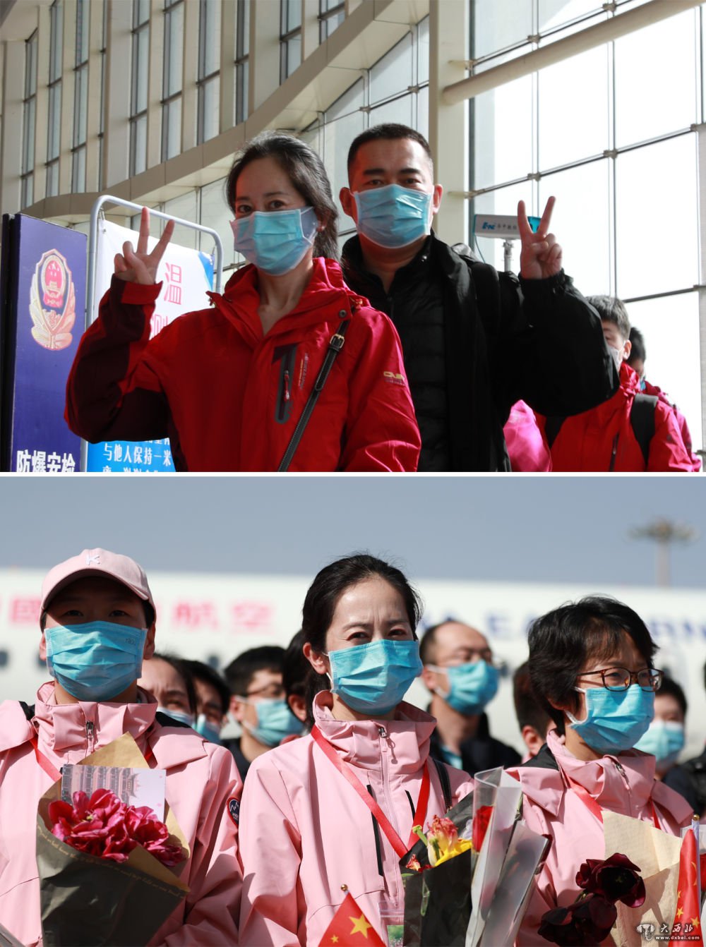 拼版照片上图是2月19日,甘肃省第五批支援湖北医疗队队员、甘肃省临夏回族自治州临夏市人民医院急诊科护士长谢文娟(左)在兰州中川国际机场办理值机;下图是3月22日,作为甘肃支援湖北医疗队第三批返回的医护人员之一,谢文娟(中)抵达兰州中川国际机场。新华社发(杜哲宇摄)