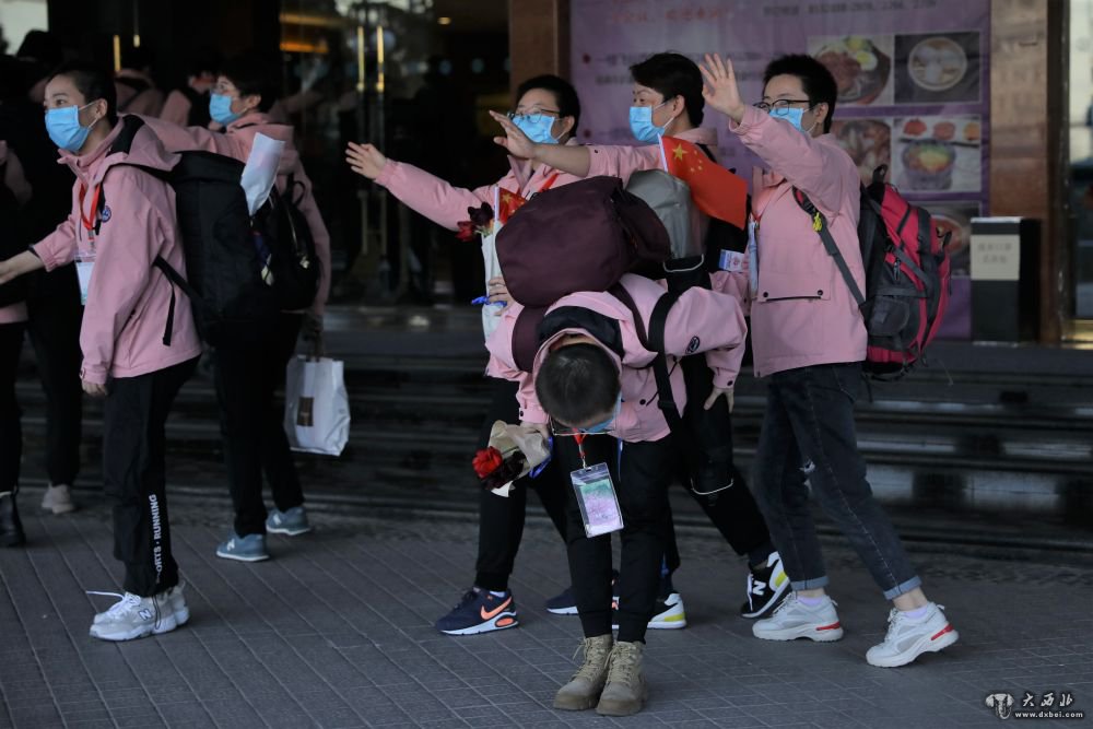 当日,甘肃支援湖北医疗队第三批返回的147名医护人员抵达兰州。该批医疗队员随后将前往隔离休整点接受为期14天的医学隔离观察。新华社发(杜哲宇摄)
