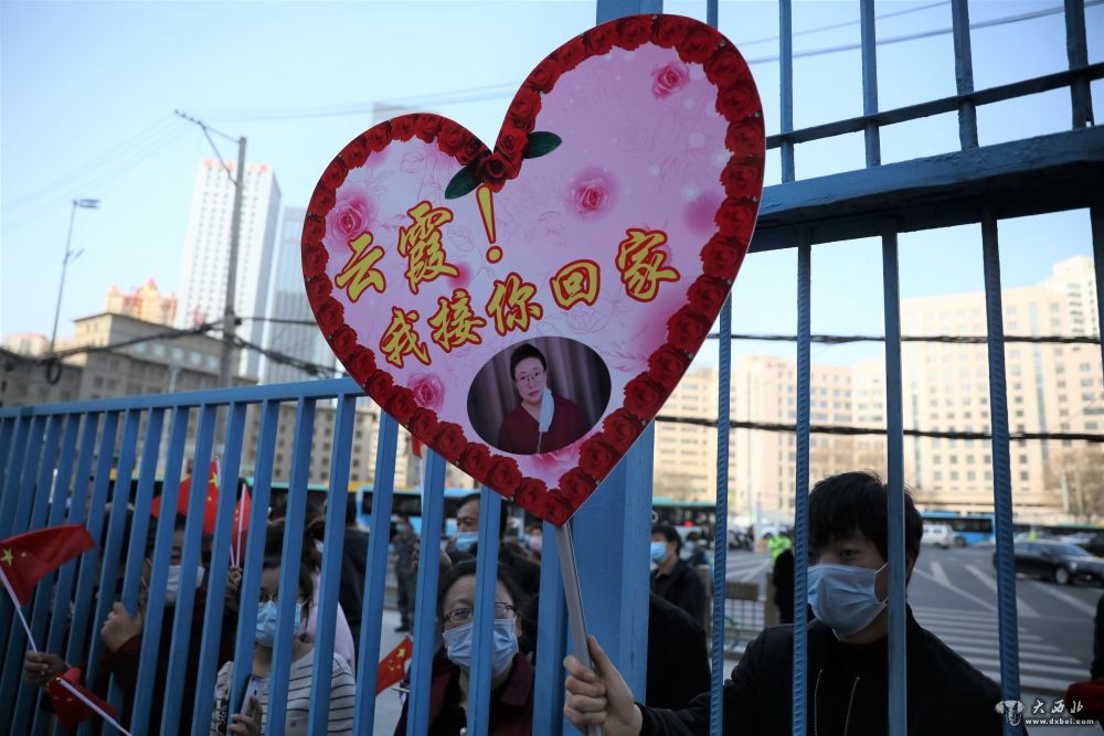 3月22日,在集中隔离休整点门外,甘肃省第三人民医院心内科护士周云霞的男友崔致慧(右一)举着自制的牌子在等待医疗队抵达。新华社发(杜哲宇摄)