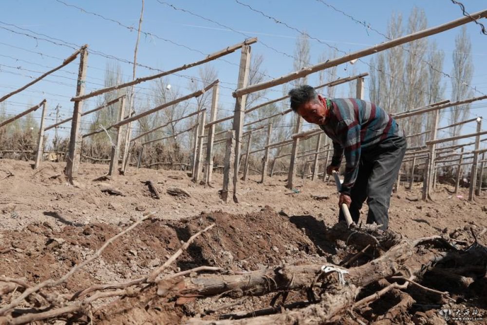 4月7日,在敦煌市郭家堡镇七号桥村,村民将埋了一个冬天的葡萄藤从地里挖出来,准备上架。