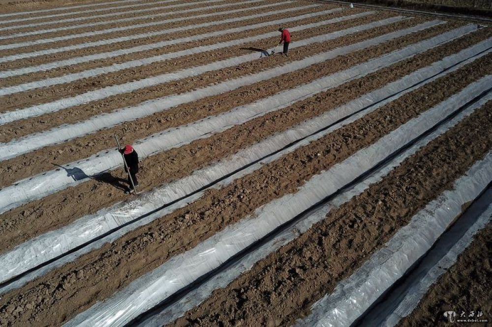 4月7日,在敦煌市郭家堡镇梁家堡村,村民在地里种西瓜(无人机照片)。新华社发(杜哲宇摄)