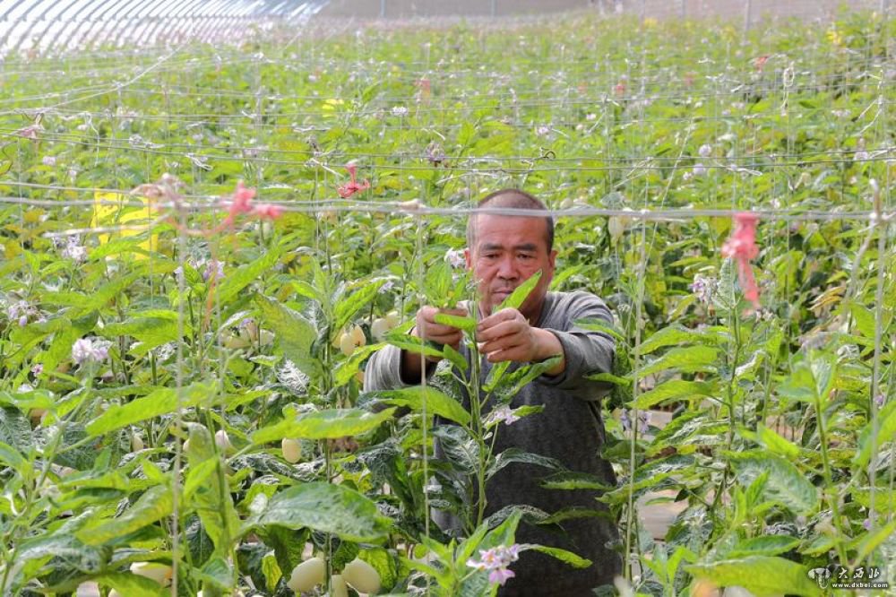 4月7日,在敦煌市郭家堡镇土塔村,村民在温室大棚给人参果植株修剪枝叶。新华社发(杜哲宇摄)