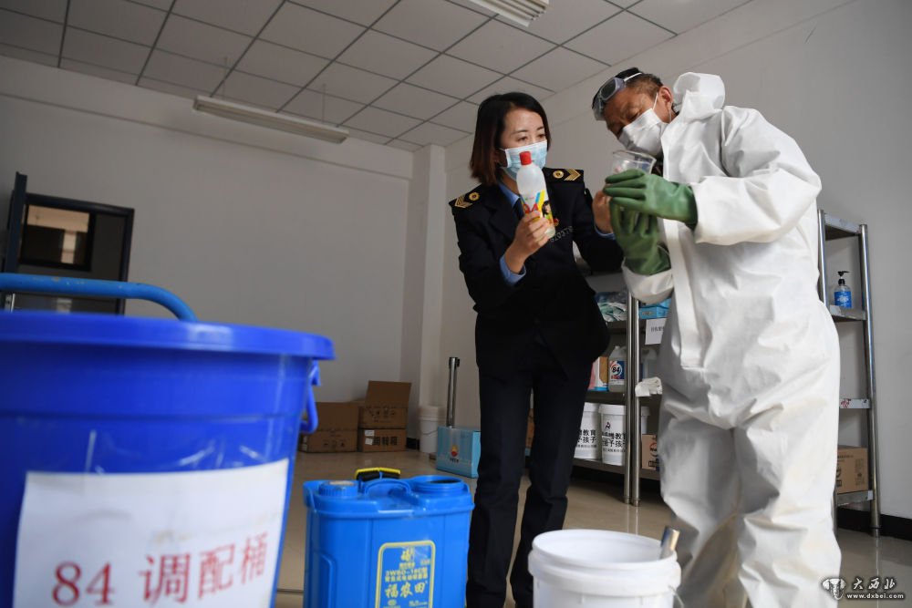 4月15日,兰州市第二十八中学“健康副校长”曹琴(左)在指导学校老师配制消毒液。新华社记者陈斌摄
