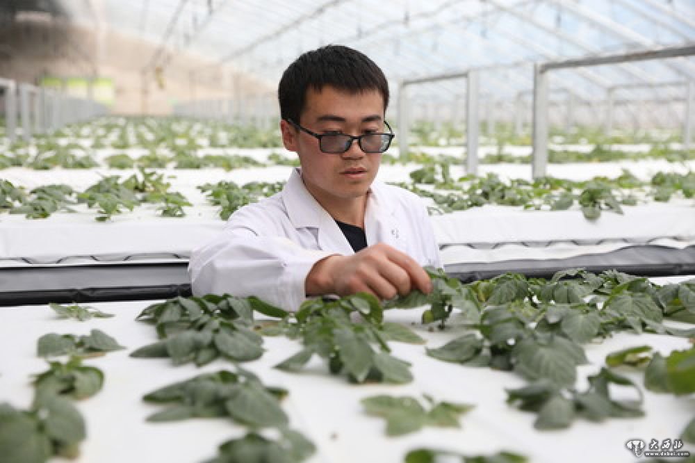 4月13日,基地工作人员在查看马铃薯幼苗的生长情况。新华社记者多蕾摄