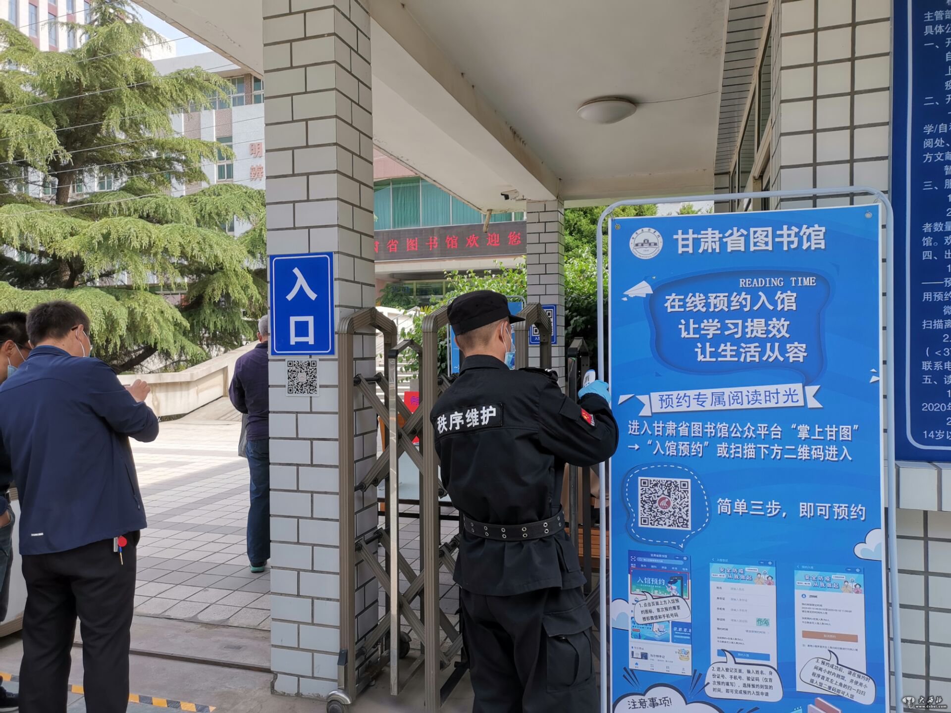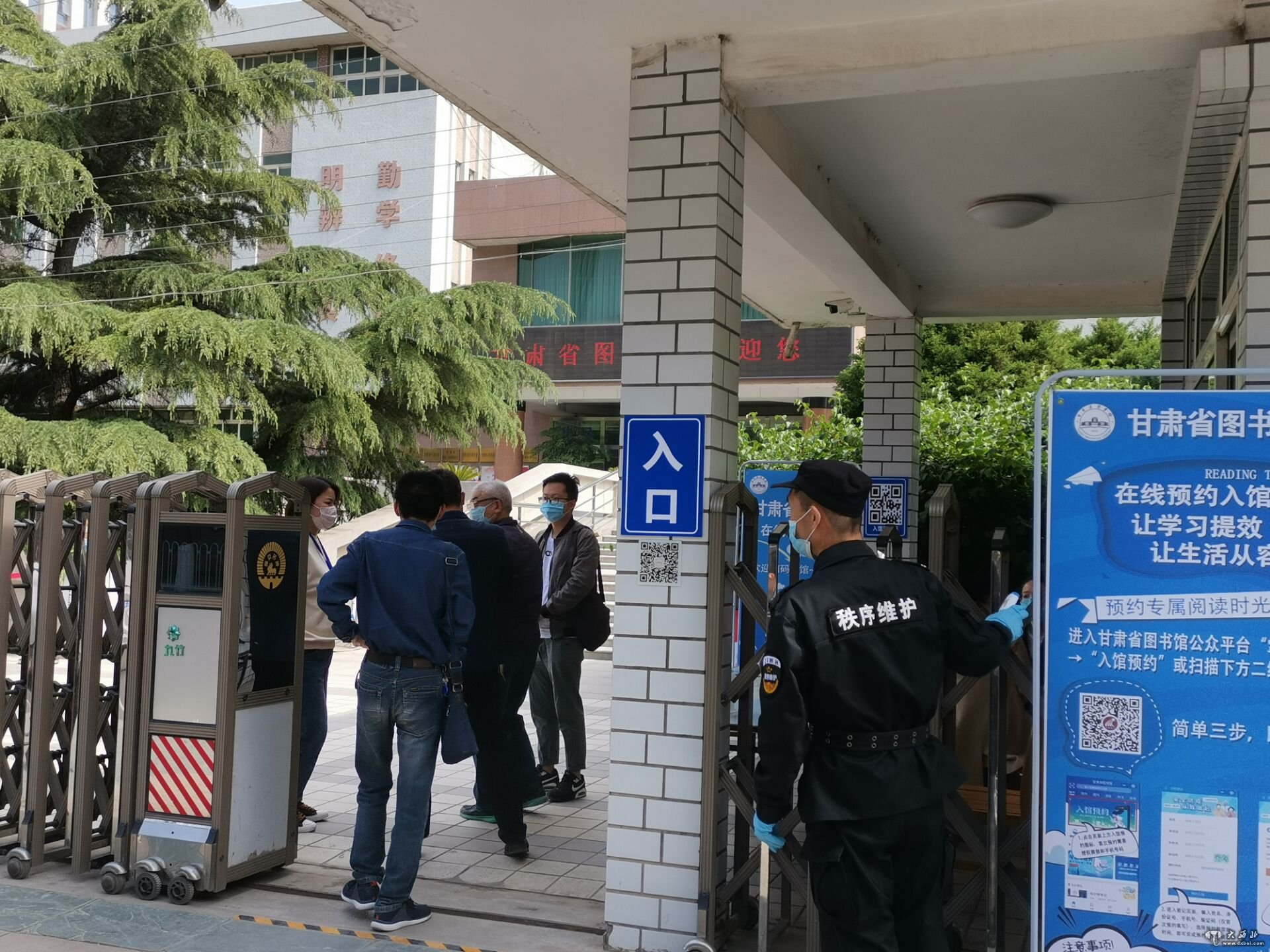 5月12日上午10时许,记者来到甘肃省图书馆。看到图书馆的大门没有开启,而在大门左右两侧临时开了两个小门。右侧的小门上面写有“”入”的大字,左侧小门写有“”出”的大字。右侧小门不时有读者进入,但需在登记本上填写上个人姓名和身份证号。正式走进图书馆内,还要经过测温(自动)和所带包安全检查。