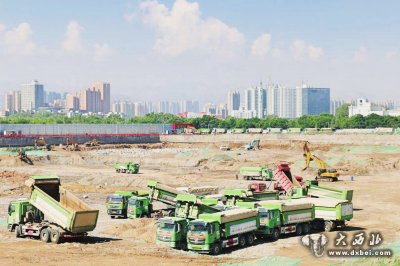 项目施工现场机器轰鸣,一派忙碌景象,项目正在紧张有序进行土方开挖和基坑施工,挖掘机、装载机、渣土车等机械设备有条不紊地运行。