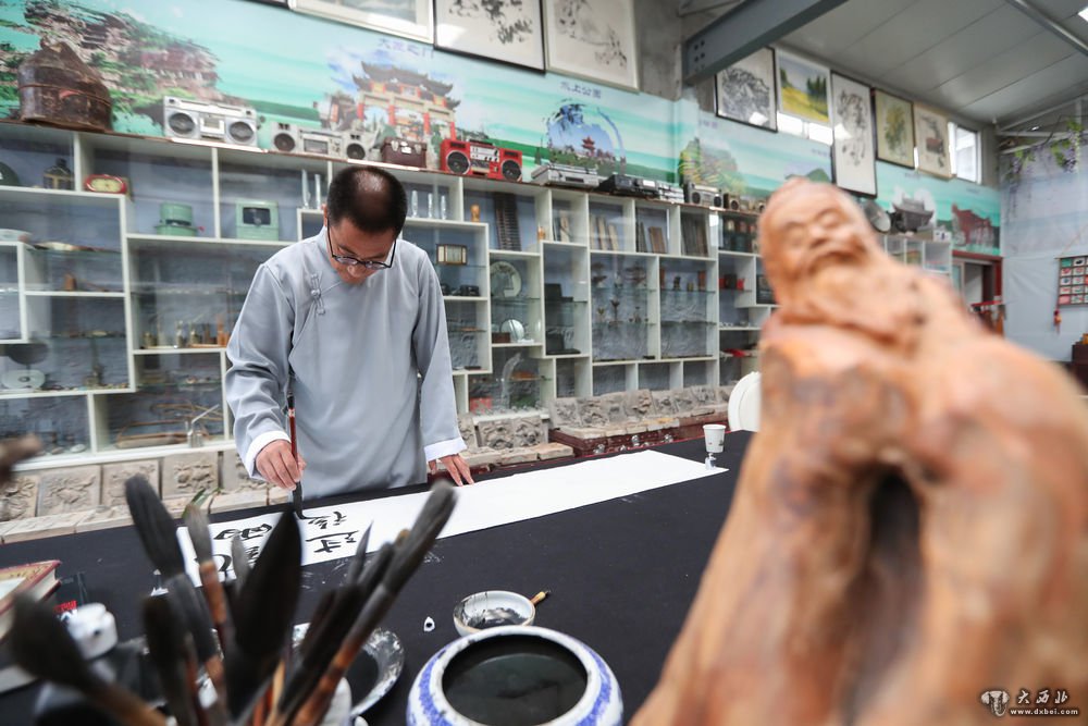 7月10日,馆长王积稼在自己开办的嘉禾博物馆内练习书法。新华社发(马希平摄)