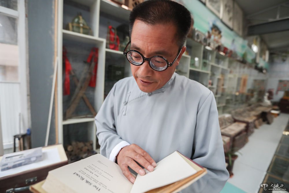 7月10日,馆长王积稼在自己开办的嘉禾博物馆内翻阅一本英文书籍。新华社发(马希平摄)