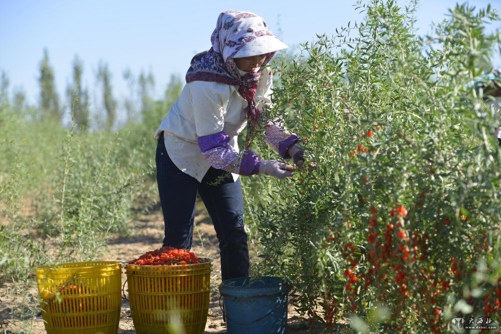 7月19日,在甘肃省张掖市高台县黑泉镇十坝村,农民在采摘成熟的枸杞。新华社发(郑耀德摄)