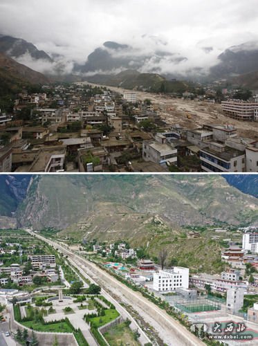 拼版照片:上图为2010年8月19日,挖掘机在舟曲县月圆村作业。从挖掘现场向上的城区泥石流核心,就是月圆村原址(新华社记者任正来摄);下图为2020年7月15日用无人机拍摄的月圆村新貌(新华社记者杜哲宇摄)。