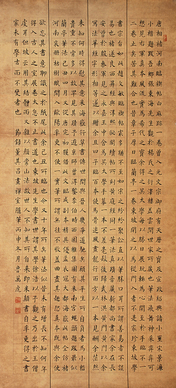 鲁万虎,别署临风阁主人。生于1965年4月,甘肃省庆阳市人。中国硬笔书法协会会员、中国电力书法家协会会员、甘肃省书法家协会会员、兰州市书法家协会会员、甘肃电力书协副主席。甘肃科源电力集团公司纪委书记、工会主席,高级经济师。早年师从陇上老书法家张致和、权保乾,2016年8月毕业于西北师大第二届书法高研班,师从李逸峰、王海雄、李贵明、曹恩东等。2017年6月毕业于甘肃省书协第十三期书法创作提高班。作品散见于《兰州日报》、《西北电业职工》、《甘肃电业》、《甘肃电力报》等报刊杂志及网站。