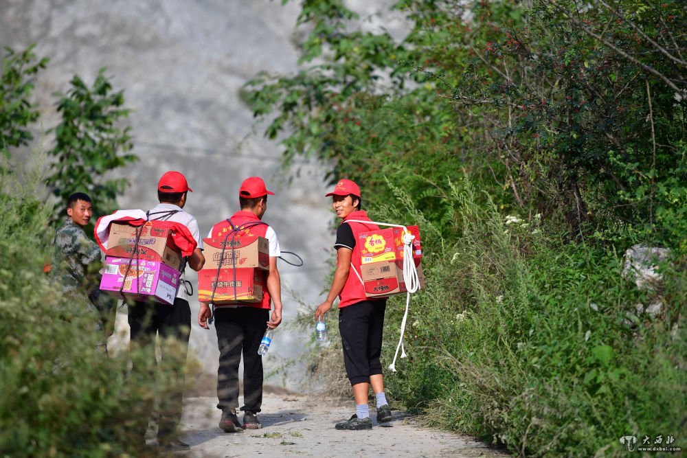 抢险救灾志愿者牟世华(右一)和同伴徒步前往受灾严重区域(8月24日摄)。新华社记者郎兵兵摄