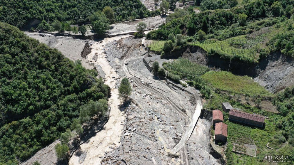 这是暴洪泥石流灾害中损毁的舟曲县曲告纳镇通往莫诺村的道路(8月24日摄,无人机照片)。新华社记者郎兵兵摄