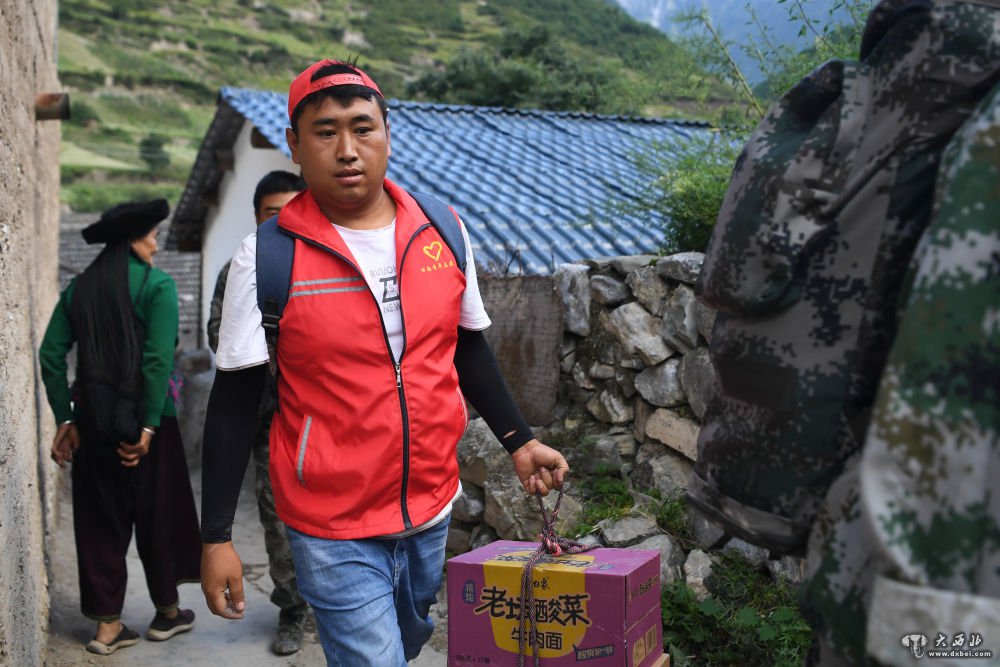 一名抢险救灾志愿者在舟曲县曲告纳镇莫诺村为受灾群众搬运生活物资(8月24日摄)。新华社记者郎兵兵摄