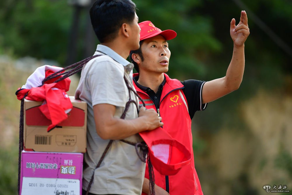 抢险救灾志愿者牟世华(右)和同伴在行进途中交流(8月24日摄)。新华社记者陈斌摄