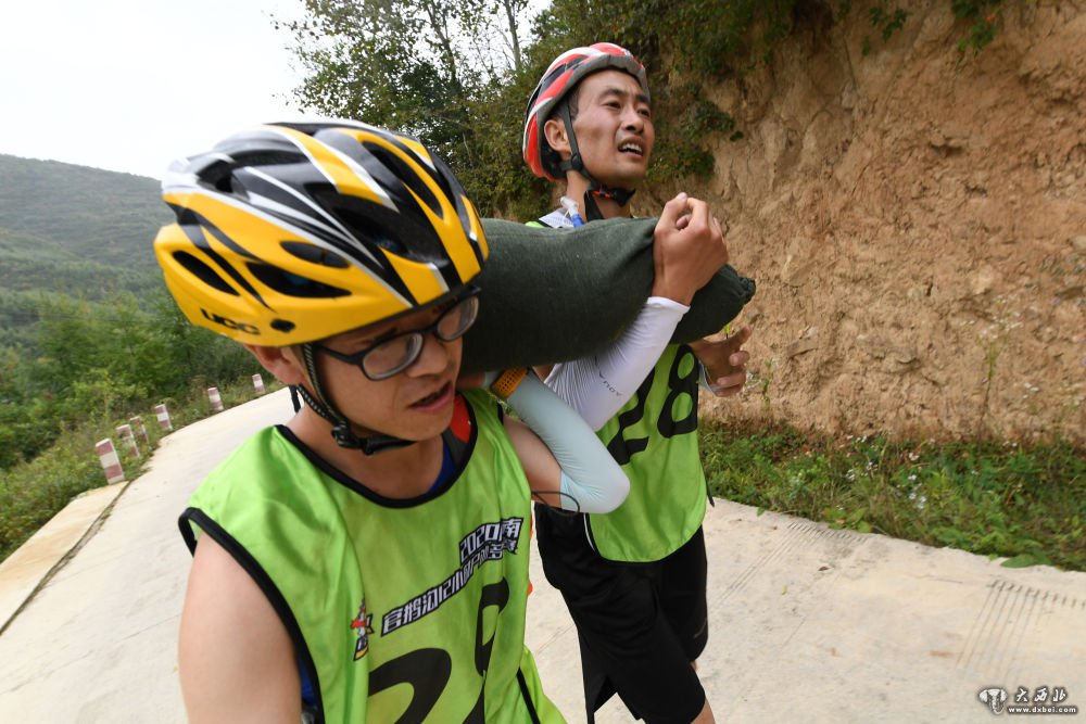 9月26日,在宕昌县官鹅沟大景区,参赛选手扛沙袋负重登高。新华社记者范培珅摄