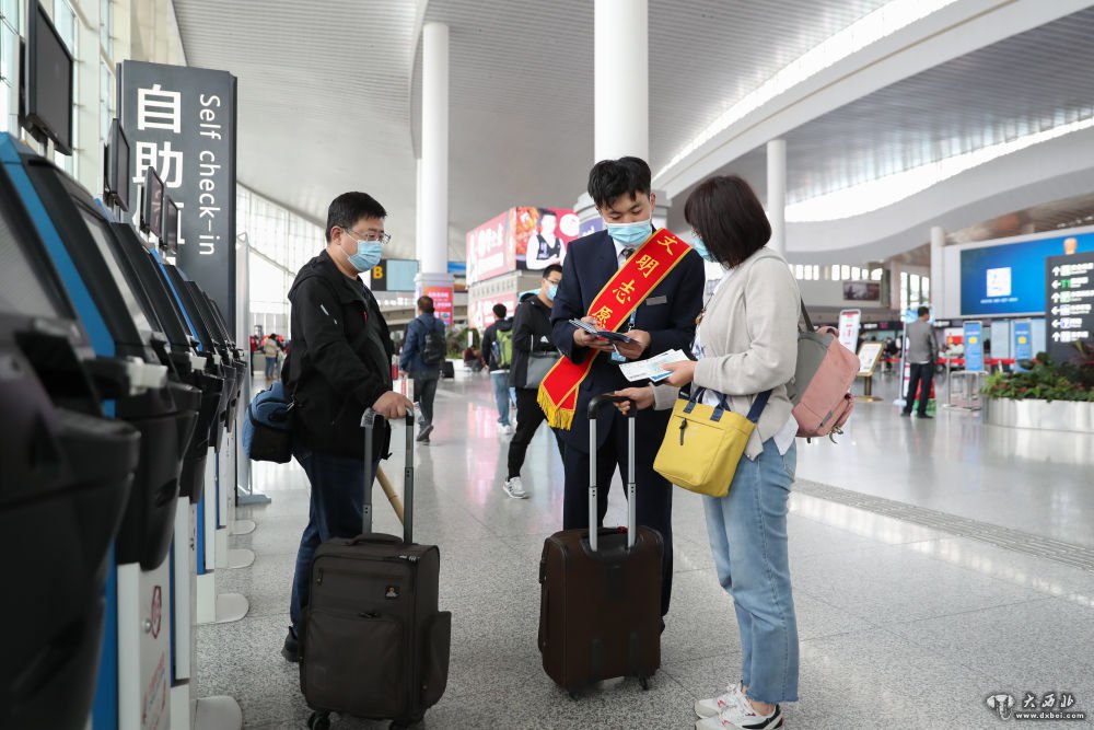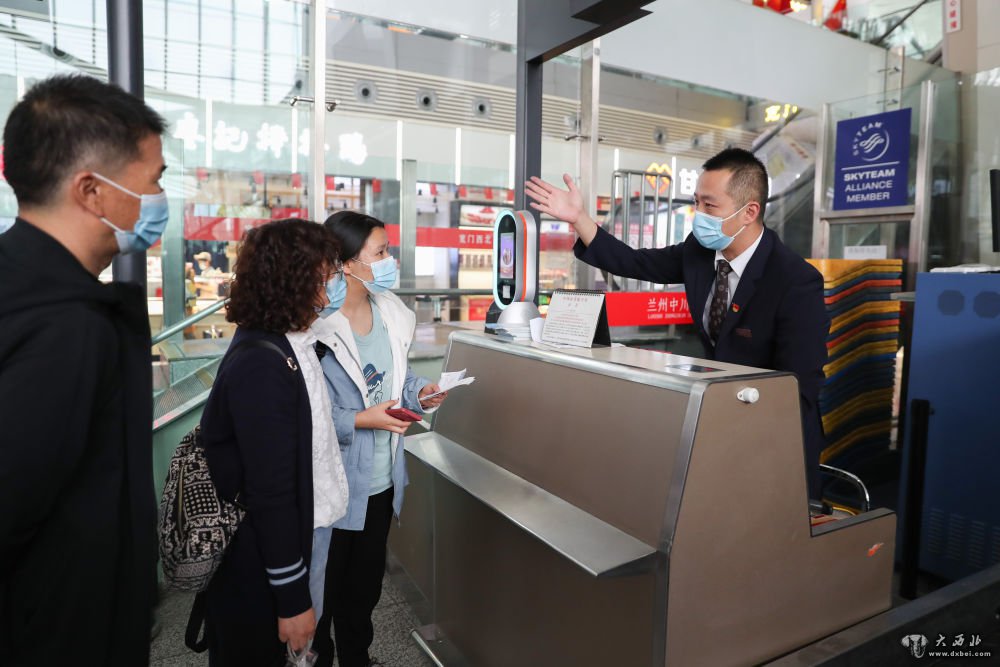 9月27日,在兰州中川国际机场,东航工作人员引导旅客办理登机手续。