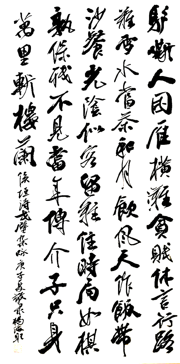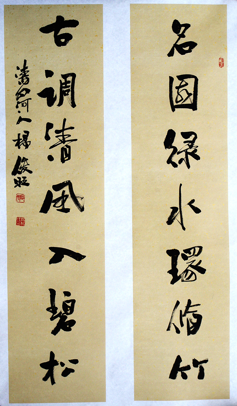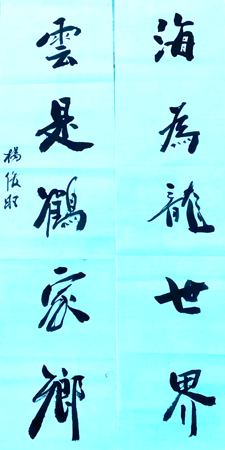 杨俊旺并非专业书家,其耕种灌溉全在业余,这一点,和多数书家没有两样。处境相似,而结果有异。翻读他的书法作品,依拙见,大致表现出了两个特点:一是遵循传统,追求变化。即学习书法始终不离传统法度,在对传统北碑的学习中,师古不泥,不断悟得,吸收营养,追求结构、用笔及线条的变化;二是解构书法,努力出新。所谓解构书法,就是研究剖析传统书艺之理,从中总结前贤的结构、用笔、变化及审美等书法奥妙,发现书法艺术的哲理与趣旨,古为今用,人为我用,取雅去俗,努力写出一种足以体现时代精神的新的书法境象。杨俊旺学书时间不算太长,但他聪明地感悟到,书法是写字,但不仅仅是写字;古人写字是出于日常实用的需要,也是当时条件所限,但现在不同,书法作为一种纯艺术形式,决不能像古人那样去实用般地“写字”,必须要像写小说、电影那样去进行艺术性的“创作”,包括整体构思、人物设置、情节铺陈及艺术手法、思想体现等等。认识的提高,思想的升华,使他进入一个艺术状态,所以能在不长的时间内走出一条颇具内涵的书法道路,并初步端显出有见个性和新意的书法特征,他的书法作品多次参加省内外展览并有获奖即是证明。