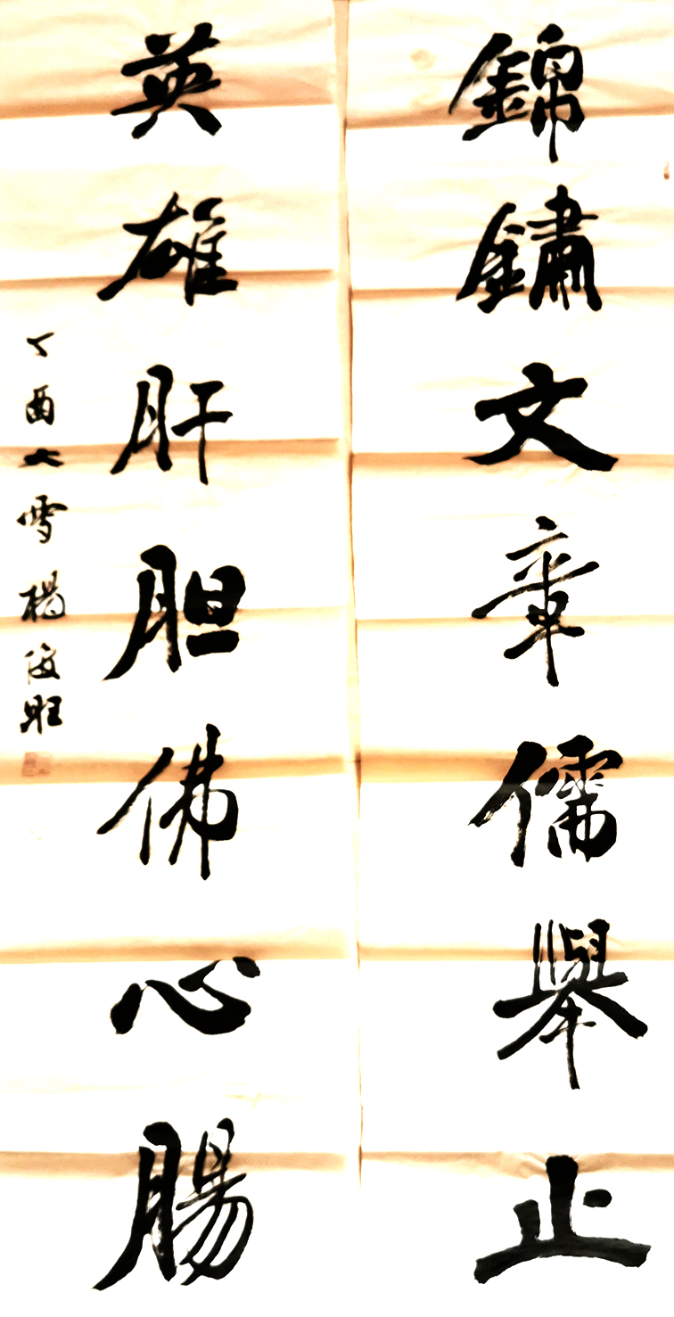 杨俊旺曾是一位军人,现在是高校老师,人很谦和,接人处事总带着点儿让人极有好感的微笑,一见面就觉得他是一个颇有素养的人。杨俊旺好上书法是在上世纪80年代,入中国书画函授大学进行了系统学习,后猎涉行草书体,尤对于右任书法用功较多。他喜爱北碑,尤其欣赏北碑那把握得当、方圆兼施的结构,以及北碑那铁骨铮铮、富有弹性的线条。在学习实践中,他发现了一个秘密:原来,于右任就是从北碑中走出进而形成自己风格的。自己喜欢北碑,抑或也是自己书法走向成功的一条路径。于是,扎进北魏碑版开始摸爬滚打,坚持不辍……这,大致就是他学习书法艺术的一次“顿悟”。