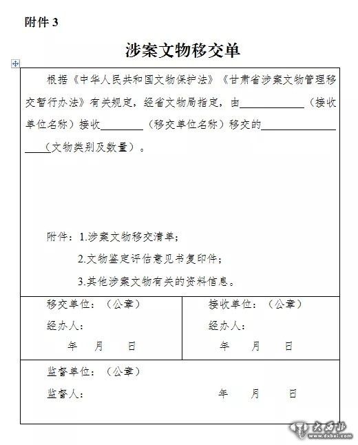11月17日,甘肃省文物局、甘肃省纪委机关、甘肃省监察委员会、甘肃省高级人民法院、甘肃省人民检察院、甘肃省公安厅、甘肃省市场监督管理局、兰州海关联合印发《甘肃省涉案文物管理移交暂行办法》(以下简称《暂行办法》)。这是甘肃省相关职能部门贯彻落实中共中央办公厅、国务院办公厅《关于加强文物保护利用改革的若干意见》及甘肃省委办公厅、省政府办公厅《关于加强文物保护利用改革的实施意见》关于规范涉案文物保护管理要求的实际举措。
