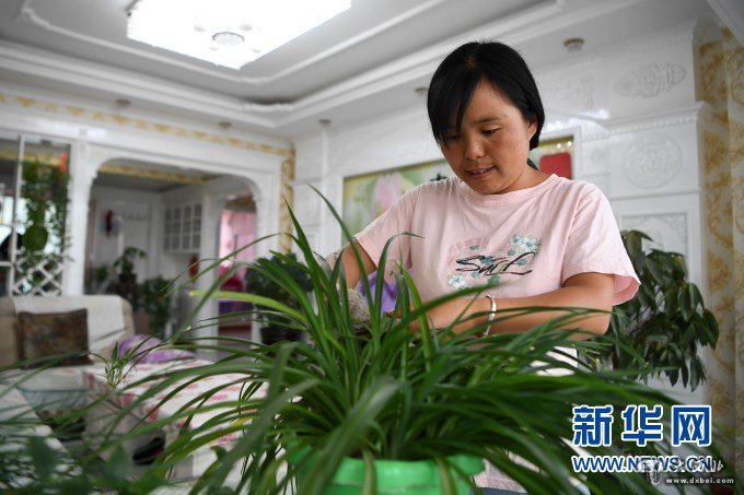 在临夏回族自治州临夏县土桥镇易地扶贫搬迁安置点,搬迁户杨喜梅在家中收拾家务(8月11日摄)。新华社记者 陈斌 摄