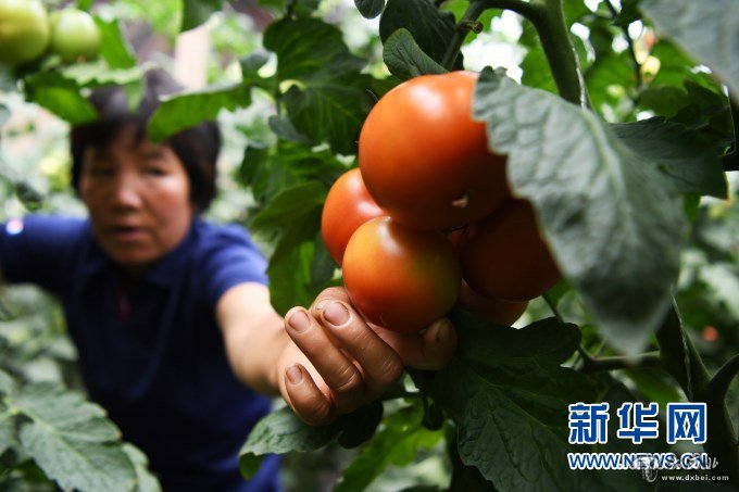 在临夏回族自治州临夏县先锋乡前韩村,易地扶贫搬迁户韩贵兰在日光温室内采摘西红柿(8月11日摄)。新华社记者 陈斌 摄
