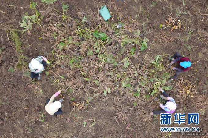 在宕昌县拉路梁中药材标准化种植示范基地,村民收获药材(9月18日摄,无人机照片)。新华社记者 范培珅 摄