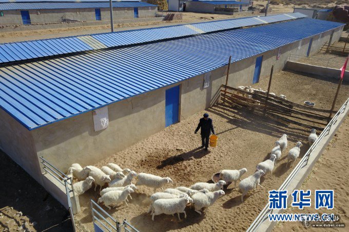 在古浪县黄花滩生态移民区富民新村养殖小区,村民李应川给羊喂水(3月10日摄,无人机照片)。新华社记者 范培珅 摄