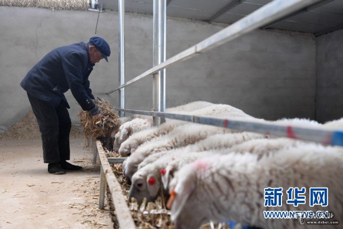 在古浪县黄花滩生态移民区富民新村养殖小区,村民李应川在喂羊(3月10日摄)。新华社记者 范培珅 摄