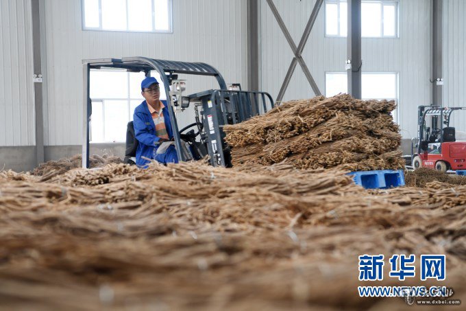 在宕昌县哈达铺琦昆现代中药材仓储物流基地,工作人员使用叉车搬运中药材(9月18日摄)。新华社记者 范培珅 摄