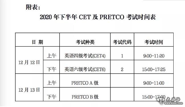 2020年下半年全国大学英语四、六级考试(简称CET)和全国高等学校英语应用能力考试(简称PRETCO)分别于12月12日和13日举行(具体时间安排见附表)。本次考试,我省CET报考179665人(其中CET4为121828人,CET6为57837人),设31个考点;PRETCO报考36511人(其中A级17075人,B级19436人),设16个考点。为确保考试平稳顺利实施,省教育考试院提醒广大考生注意以下事项: