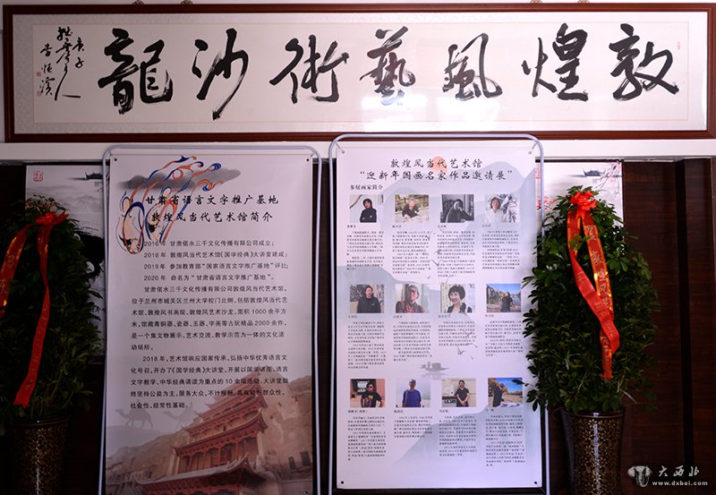 大西北网讯 2020年12月31日,甘肃敦煌风当代艺术馆墨香四溢,彩笔挥舞,琴声悠扬,诗声朗朗。来自甘肃书画、语言文字、演讲等文化领域的200多人在此聚会,参加甘肃偌水三千文化传播有限公司在敦煌风现代艺术馆举行的首批省级语言文字基地挂牌仪式。另外,“迎新年馆藏名家书法作品展览”、敦煌风艺术沙龙开业暨迎新年联谊会、敦煌风书画院成立、“迎新年国画名家作品邀请展”等多项活动同时在这里举办。通过精彩丰富的文化活动迎接2021年新年的到来。