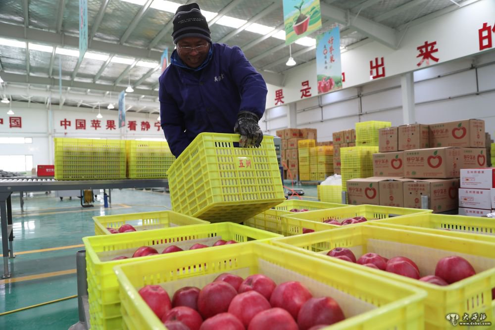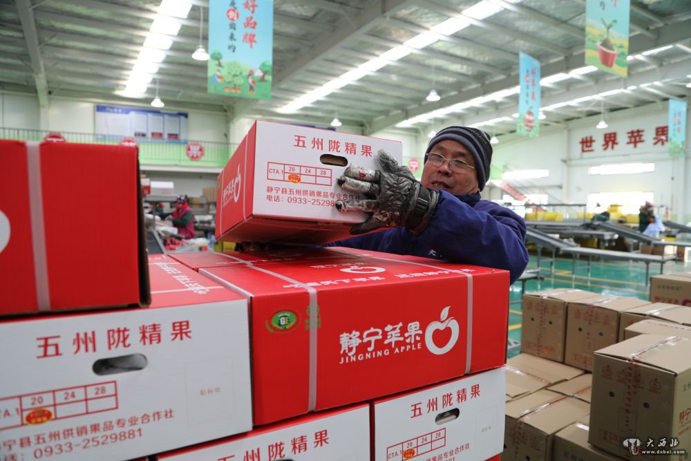 1月12日,在静宁县苹果标准化分选中心,工作人员将打包装箱的苹果摆放整齐。