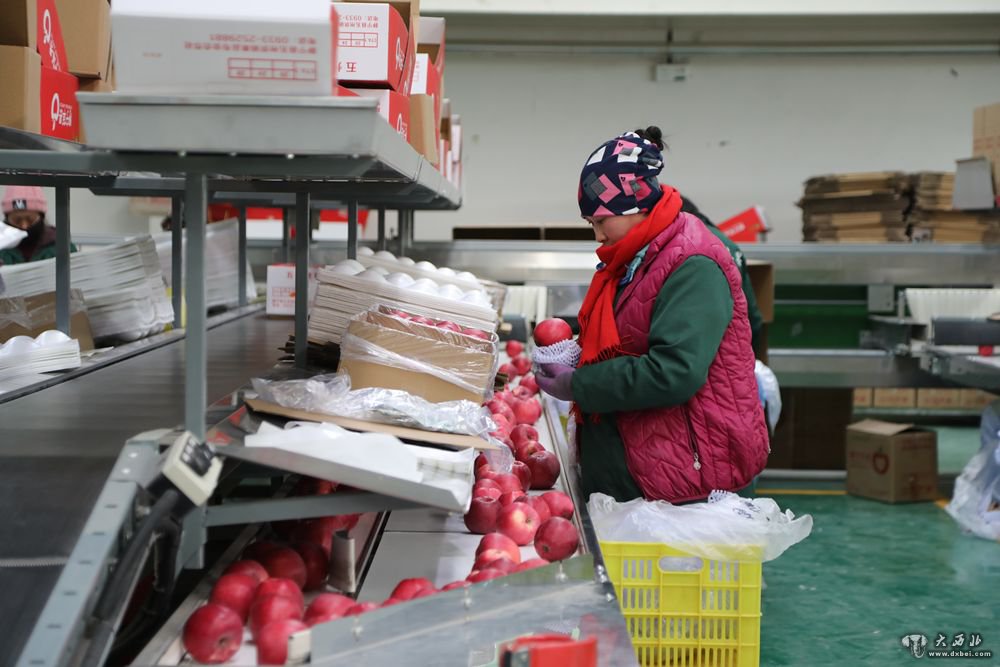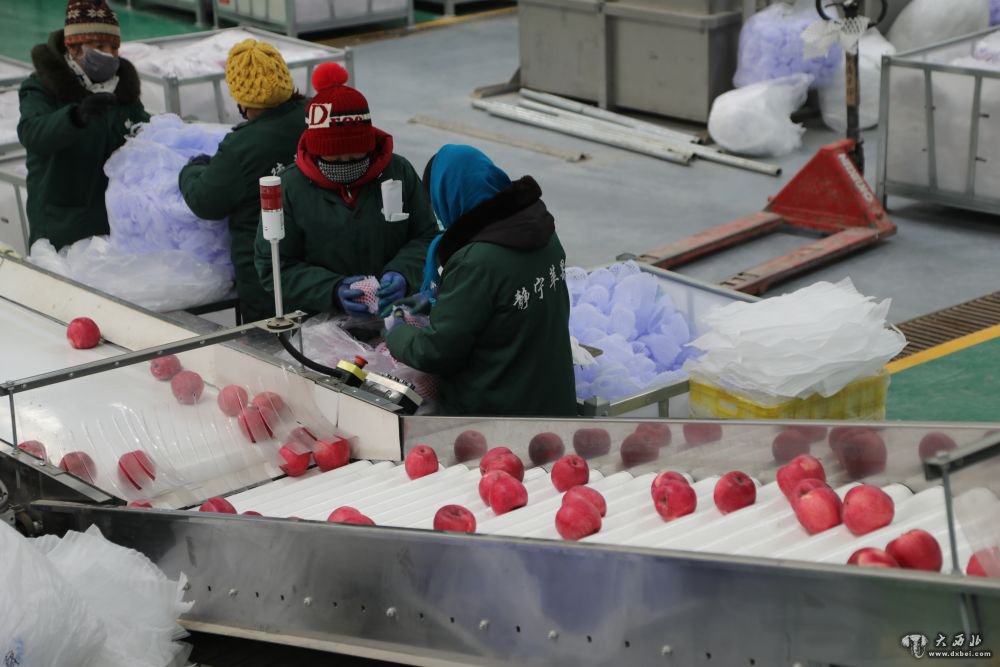 1月12日,在静宁县苹果标准化分选中心,工作人员在苹果自动分拣机旁忙碌。新华社记者马莎摄