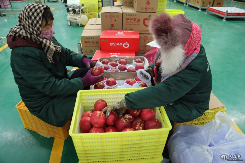 1月12日,在静宁县苹果标准化分选中心,工作人员为苹果礼品盒装箱。新华社记者马莎摄