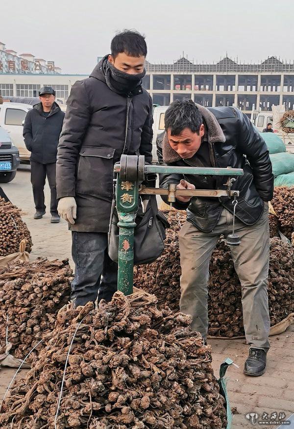 1月15日,药农和客商在甘肃省定西市岷县的中国当归城对当归过秤。新华社记者 郎兵兵 摄