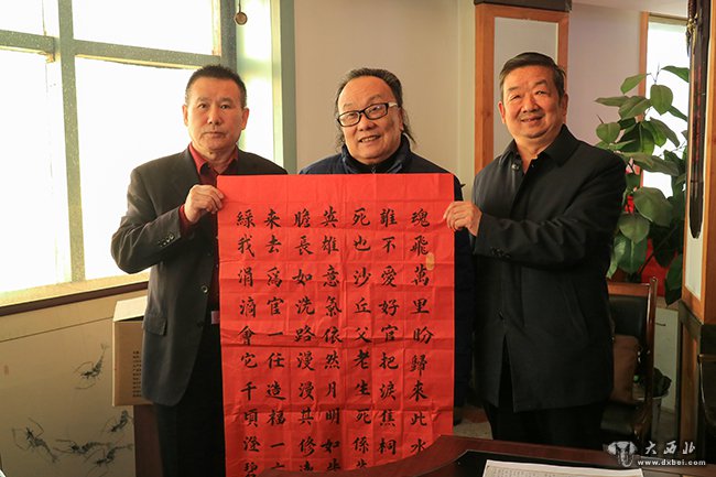 书画艺术家李学舜向身残志坚的金鑫先生赠送书画作品。 贾笑云 摄