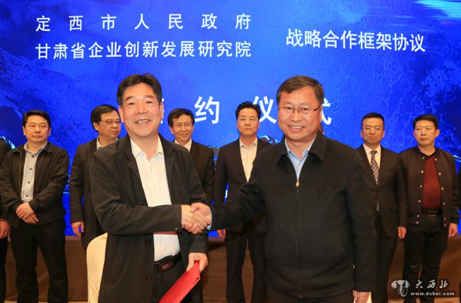 定西市副市长张应钦与甘肃省企业创新发展研究院监事长连新占签订合作协议。 贾笑云 摄
