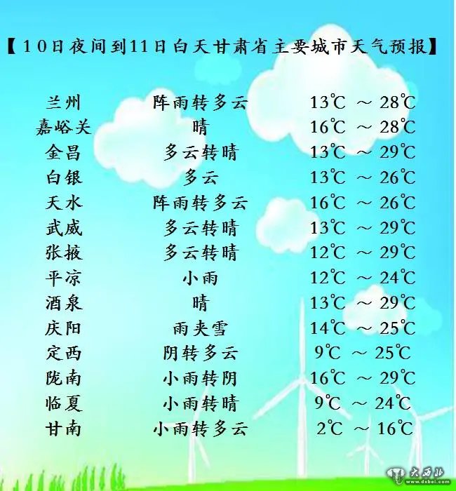 10日夜间到11日白天,甘南、陇南、天水、平凉等州市阴有小雨,局部地方有中雨,兰州、临夏、定西、庆阳等市州阴有小雨转多云;省内其余地方晴或多云。