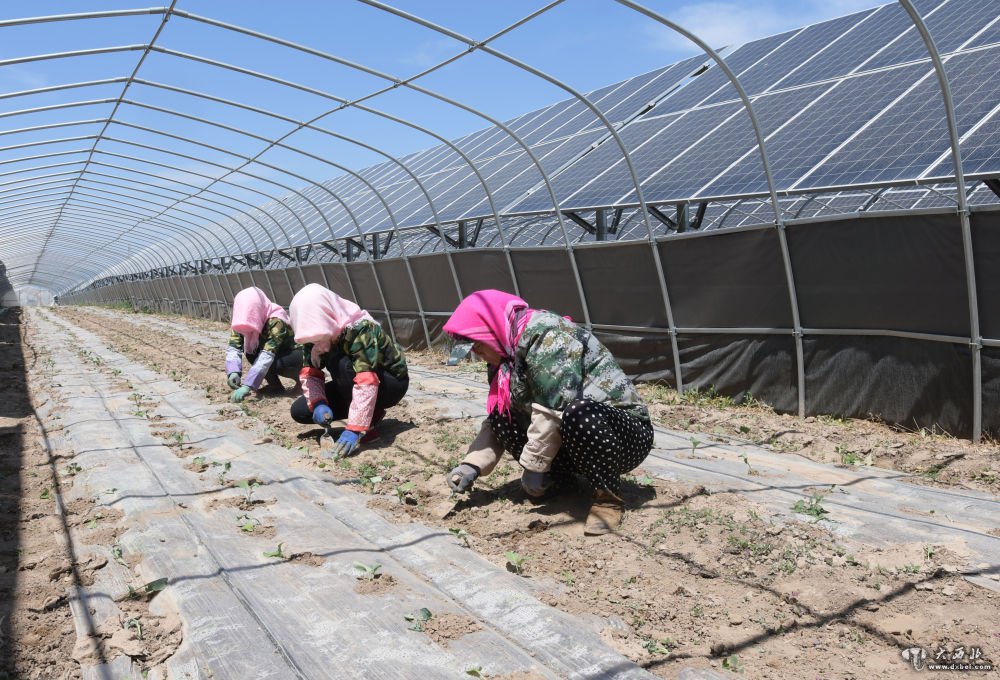 农民在东乡县考勒乡坡根村“农光互补”光伏发电场的大棚内忙碌(5月12日摄)。新华社发(史有东摄)