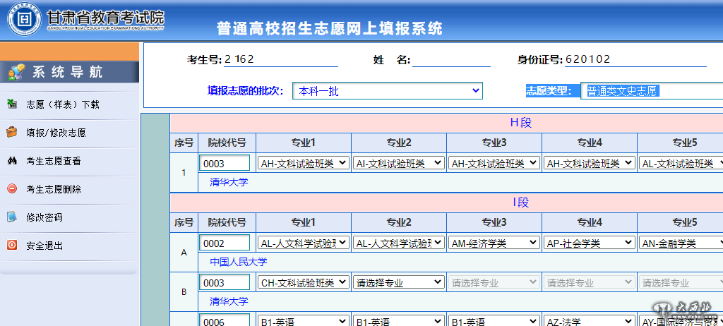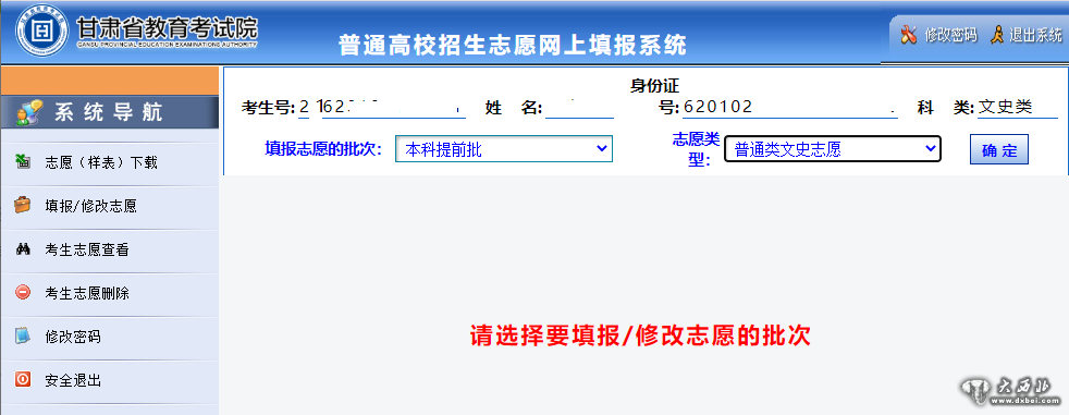 7、志愿提交后,如考生要修改某批次志愿,点击“系统导航”栏中的“填报/修改志愿”选项,选择批次后,使用“志愿提交密码”修改志愿。