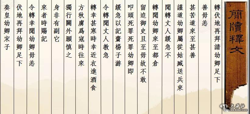 緩急。以記齎楊子游,令轉聞丈人教急,轉幸甚。寒時,幸近衣、進酒食。方秋,虜爲寇,時往來,獨行關外,願慎之,身非有副它。來者時賜記,令轉幸聞幼卿毋恙。伏地再拜,幼卿足下。奏皇幼卿、宋子□