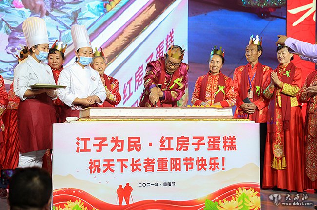 江子为民和红房子公司为现场的老人献上大蛋糕,祝天下老人重阳节快乐! 贾笑云 摄