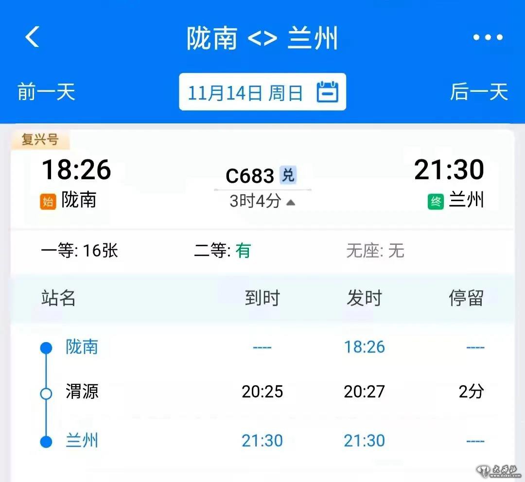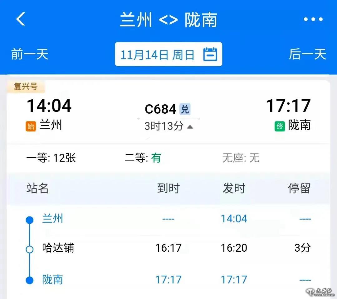 11月14日起,恢复开行兰州至陇南C684/3次列车1对。兰州至陇南C684次,14:04从兰州始发,17:17抵达陇南;陇南至兰州C683次,18:26从陇南始发,21:30抵达兰州。